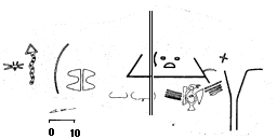 ![]() Plan view of some Santa Valley geoglyphs from Peru. The scale at the lower left represents 10 meters. The vertical double line is not a geoglyph but rather the azimuth heading 280-degrees. It is hard to imagine how such underground drawings could be used for rituals. |