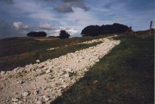 The Hackpen or Broad Hinton horse as it is also known as it is close to Broad Hinton village. This horse is 90’ square and faces WNW. The horse lies on the high (600’) but gentle slope of Hackpen hill just below the Ridgeway and to the right of the Broad Hinton to Marlborough Road (B4041). It can be seen from this road which offers the best view and also from the A361 near Broad Hinton. There is a car park where the Ridgeway crosses the B4041 and over the road there is a footpath down to the horse. The horse is in a very poor state, very overgrown and not very conspicuous from the road. This is in complete contrast to 1995 when the horse was in excellent condition and shows how easily these figures may become lost. The figure is slightly raised from the surrounding grass. The chalk is almost completely obscured by dried grass, what chalk remains visible is small compacted pieces. The fence is missing but repairs looked imminent and perhaps this enclosure will prelude a scouring of the horse. It is uncertain as to the party responsible for the horse.